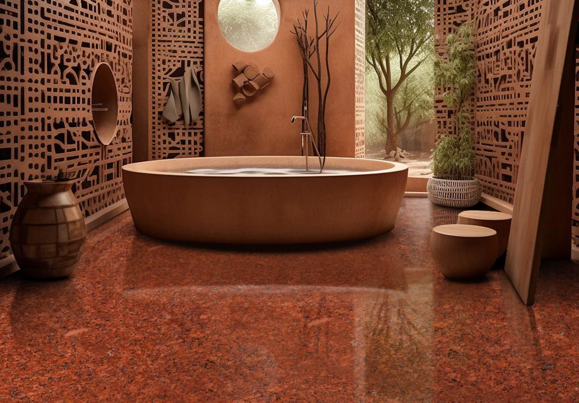 Lakha Red Granite flooring exudes a rich, majestic appeal with its vivid red base and intricate black and grey speckles. Known for its exceptional strength and longevity, it’s ideal for high-traffic areas in both homes and commercial spaces. Its polished surface adds a glossy, premium feel, while textured options provide better grip and a natural look. Bring warmth and elegance to your interiors with this vibrant flooring solution.